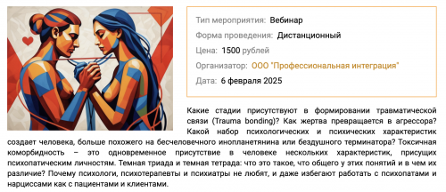 Приглашаем вас на вебинар, где изучим понятие "травматической связи", определим факторы, когда устанавливаются сильные эмоциональные связи, чтобы связать двух людей после инцидента, в котором один человек выражает насильственное поведение, ведет себя оскорбительно, пугающе и угрожающе. Эта эмоциональная зависимость между двумя людьми, характеризуется периодами насилия и дисбаланса сил. Разберем поведенческие стратегии обоих индивидов, которые парадоксальным образом укрепляют и поддерживают связь, что отражается в порочном круге насилия.